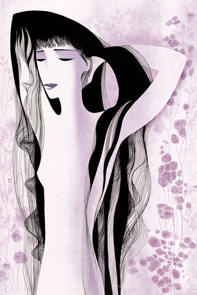 Nous vous proposons une reproduction artisanale sur toile du célèbre tableau 'Fille eyvind avec les cheveux corbeau' de Eyvind Earle, provenant du Musée de la Reproduction.