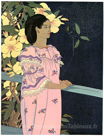 Nous vous proposons une reproduction artisanale sur toile du célèbre tableau 'Fleur de Soir Truck - Toloas' de Paul Jacoulet, provenant du Musée de la Reproduction.
