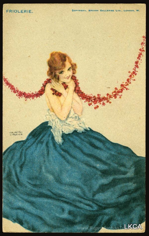 Nous vous proposons une reproduction artisanale sur toile du célèbre tableau 'Friolerie' de Raphael Kirchner, provenant du Musée de la Reproduction.