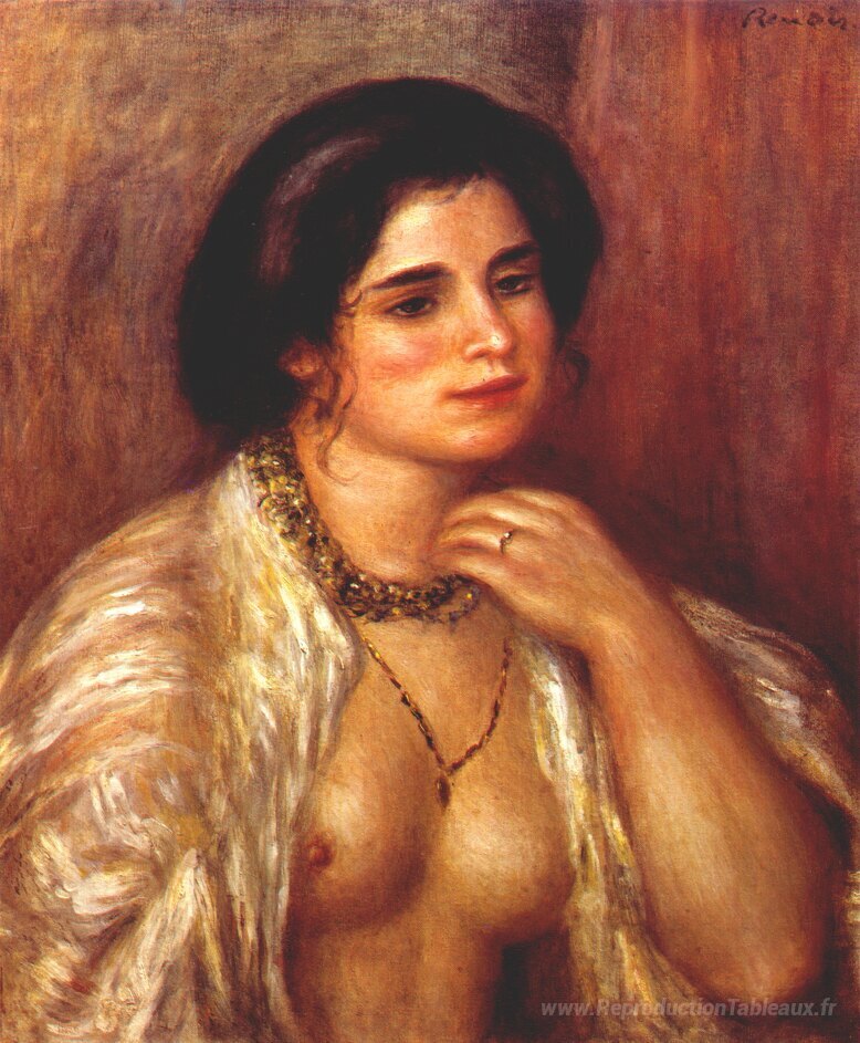 Nous vous proposons une reproduction artisanale sur toile du célèbre tableau 'Gabrielle avec des seins nus' de Pierre-Auguste Renoir, provenant du Musée de la Reproduction.