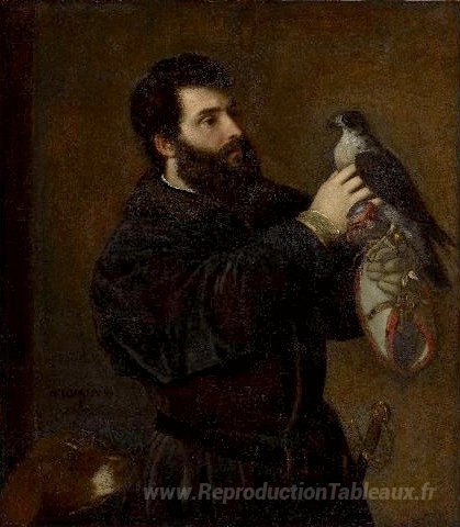 Nous vous proposons une reproduction artisanale sur toile du célèbre tableau 'Giorgio Cornaro avec un faucon' de Titian, provenant du Musée de la Reproduction.