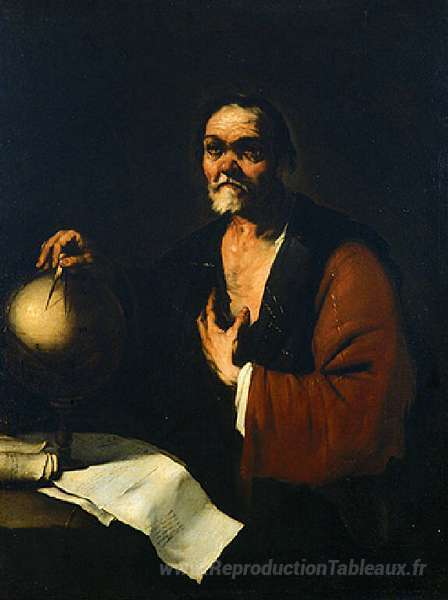 Nous vous proposons une reproduction artisanale sur toile du célèbre tableau 'Héroclito' de Luca Giordano, provenant du Musée de la Reproduction.
