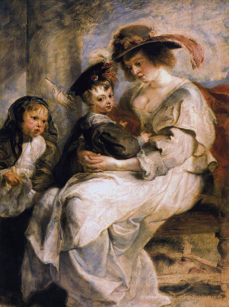 Nous vous proposons une reproduction artisanale sur toile du célèbre tableau 'Helene Fourment avec ses enfants' de Peter Paul Rubens, provenant du Musée de la Reproduction.
