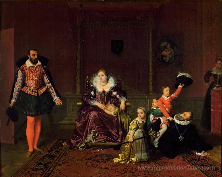 Nous vous proposons une reproduction artisanale sur toile du célèbre tableau 'Henry IV recevant l'ambassadeur d'Espagne' de Jean Auguste Dominique Ingres, provenant du Musée de la Reproduction.
