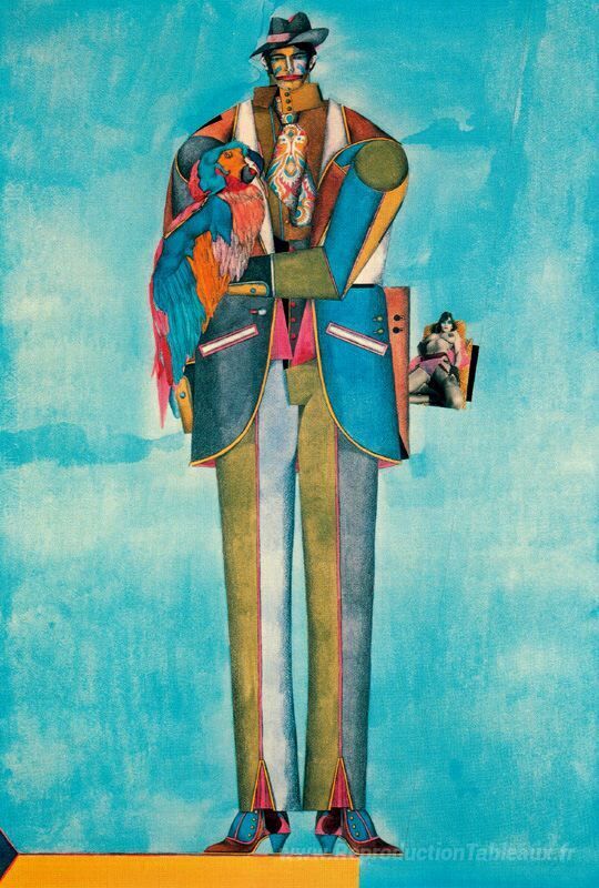 Nous vous proposons une reproduction artisanale sur toile du célèbre tableau 'Homme avec perroquet' de Richard Lindner, provenant du Musée de la Reproduction.
