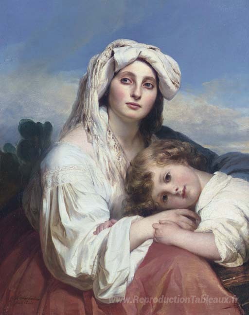 Nous vous proposons une reproduction artisanale sur toile du célèbre tableau 'Italienne avec enfant' de Franz Xaver Winterhalter, provenant du Musée de la Reproduction.