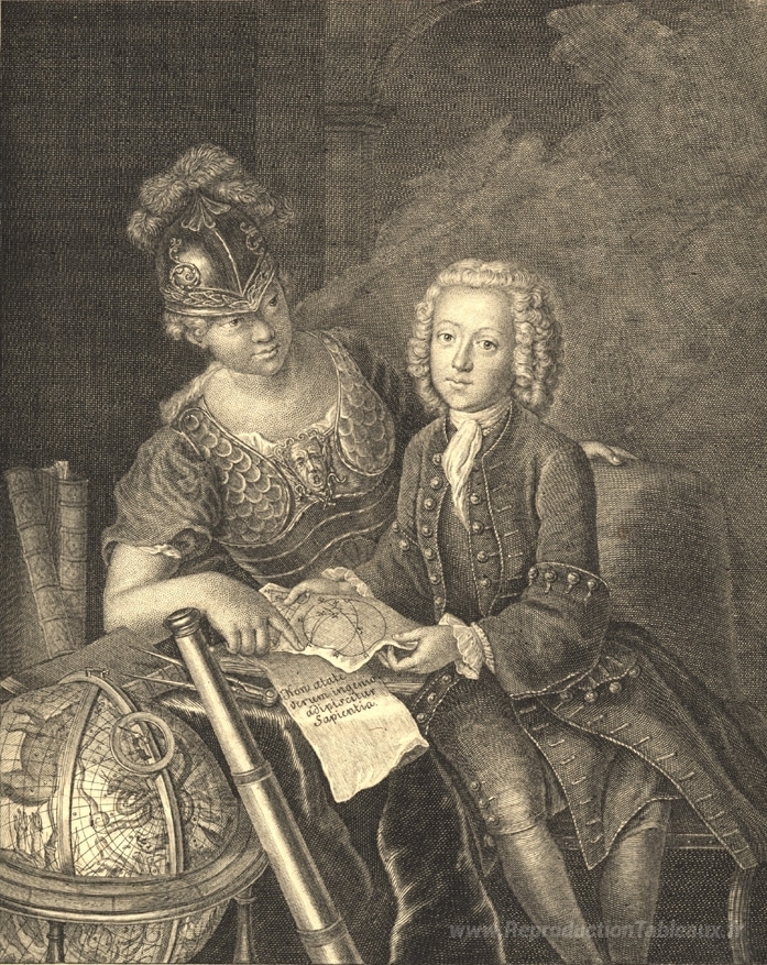 Nous vous proposons une reproduction artisanale sur toile du célèbre tableau 'Jean Philippe Baratier présenté par Minerva, érudit allemand' de Antoine Pesne, provenant du Musée de la Reproduction.