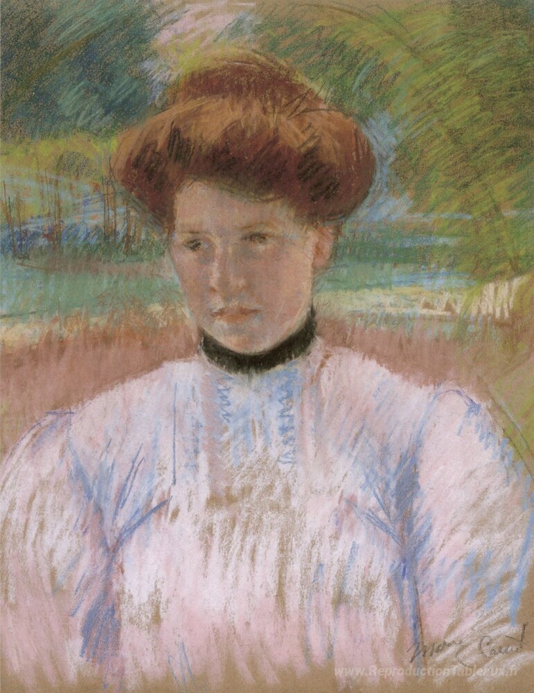 Nous vous proposons une reproduction artisanale sur toile du célèbre tableau 'Jeune femme aux cheveux auburn dans un chemisier rose' de Mary Cassatt, provenant du Musée de la Reproduction.