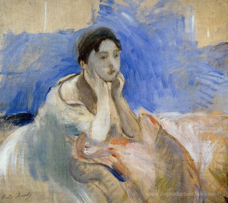 Nous vous proposons une reproduction artisanale sur toile du célèbre tableau 'Jeune femme s'appuyant sur ses coudes' de Berthe Morisot, provenant du Musée de la Reproduction.