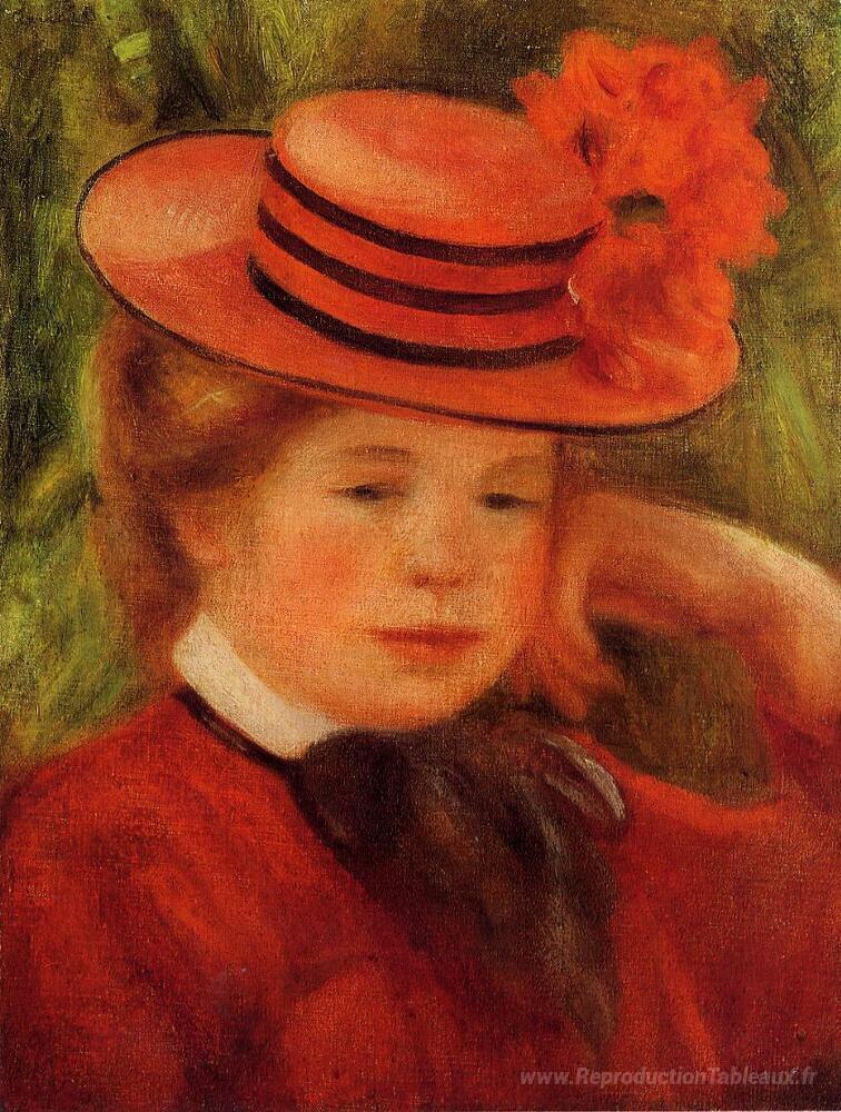 Nous vous proposons une reproduction artisanale sur toile du célèbre tableau 'Jeune fille dans un chapeau rouge' de Pierre-Auguste Renoir, provenant du Musée de la Reproduction.