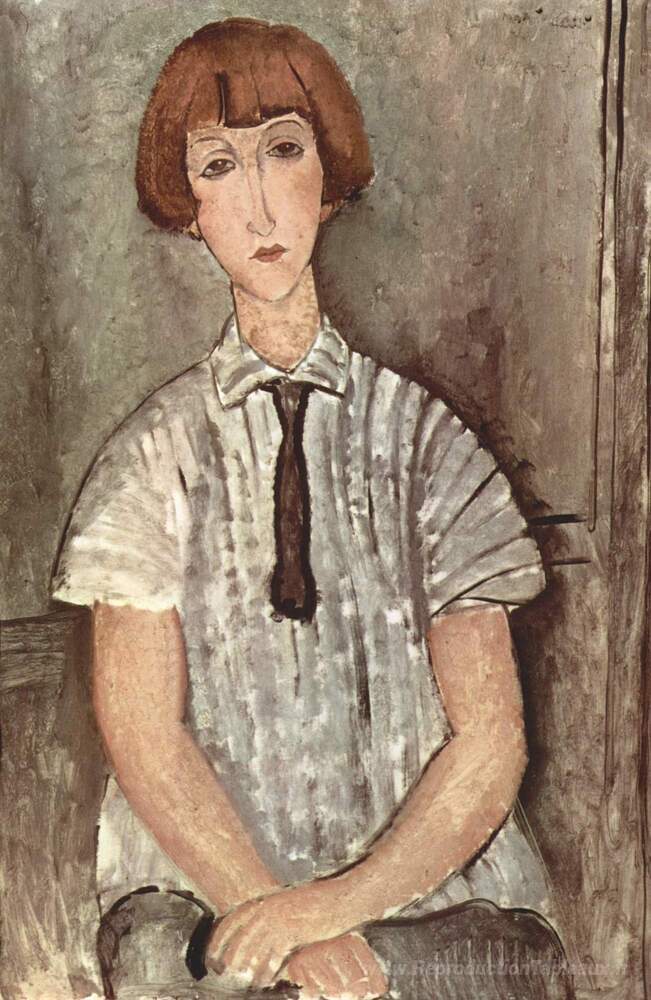 Nous vous proposons une reproduction artisanale sur toile du célèbre tableau 'Jeune fille dans une chemise rayée' de Amedeo Modigliani, provenant du Musée de la Reproduction.