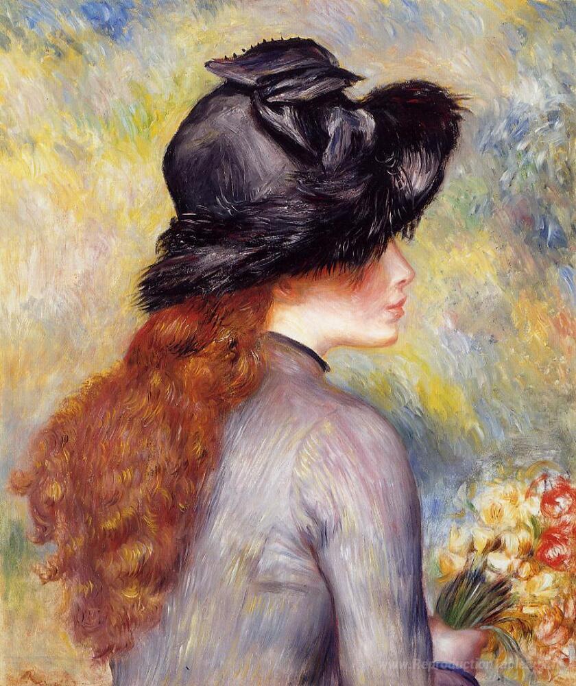 Nous vous proposons une reproduction artisanale sur toile du célèbre tableau 'Jeune fille tenant au bouquet de tulipes' de Pierre-Auguste Renoir, provenant du Musée de la Reproduction.
