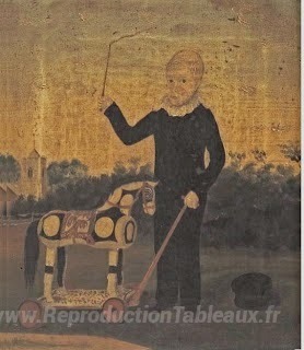 Nous vous proposons une reproduction artisanale sur toile du célèbre tableau 'Jeune garçon avec cheval jouet' de John Bradley, provenant du Musée de la Reproduction.