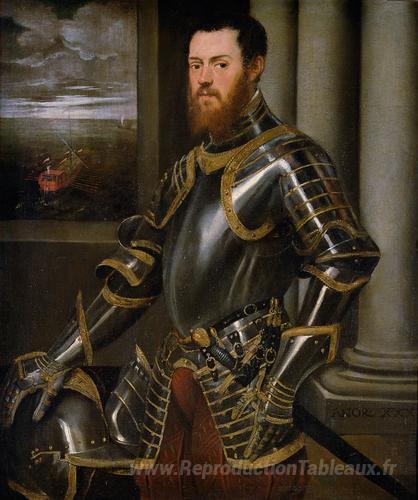 Nous vous proposons une reproduction artisanale sur toile du célèbre tableau 'Jeune homme dans un costume d'armure décoré en or' de Tintoretto, provenant du Musée de la Reproduction.