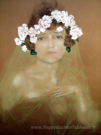 Nous vous proposons une reproduction artisanale sur toile du célèbre tableau 'Justine Johnstone' de Raphael Kirchner, provenant du Musée de la Reproduction.