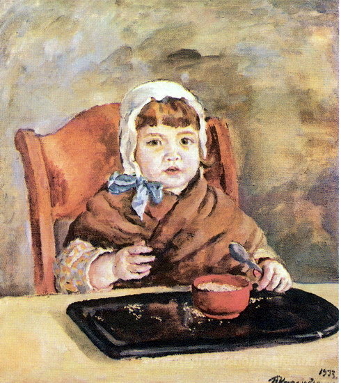 Nous vous proposons une reproduction artisanale sur toile du célèbre tableau 'Katya avec des grains' de Pyotr Konchalovsky, provenant du Musée de la Reproduction.