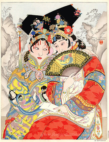 Nous vous proposons une reproduction artisanale sur toile du célèbre tableau 'La Confidential' de Paul Jacoulet, provenant du Musée de la Reproduction.