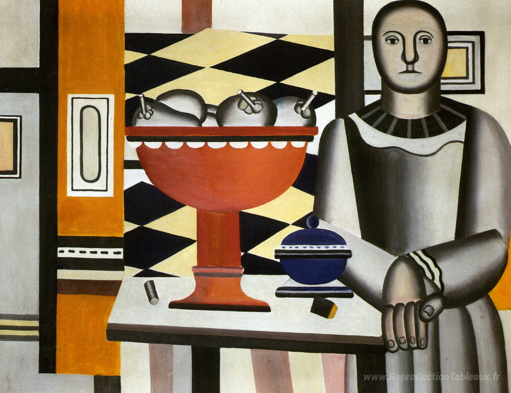 Nous vous proposons une reproduction artisanale sur toile du célèbre tableau 'La femme avec le plat de fruits' de Fernand Leger, provenant du Musée de la Reproduction.