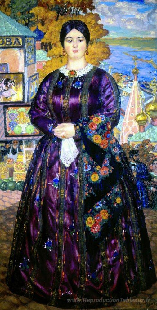 Nous vous proposons une reproduction artisanale sur toile du célèbre tableau 'La femme du marchand' de Boris Kustodiev, provenant du Musée de la Reproduction.