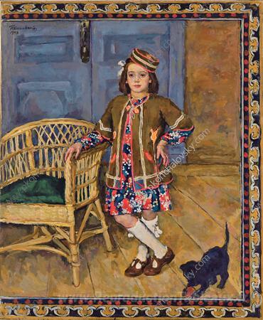Nous vous proposons une reproduction artisanale sur toile du célèbre tableau 'La fille dans la robe du Caucase avec un chat (Margot)' de Pyotr Konchalovsky, provenant du Musée de la Reproduction.