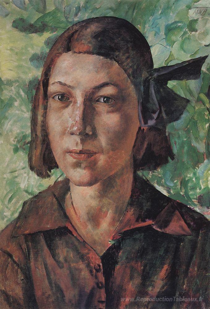 Nous vous proposons une reproduction artisanale sur toile du célèbre tableau 'La fille dans le jardin' de Kuzma Petrov-Vodkin, provenant du Musée de la Reproduction.
