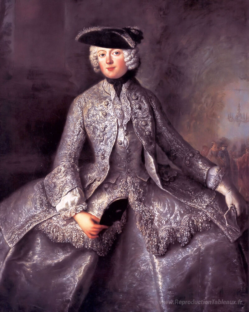 Nous vous proposons une reproduction artisanale sur toile du célèbre tableau 'La princesse Amalia de Prusse en Amazon' de Antoine Pesne, provenant du Musée de la Reproduction.