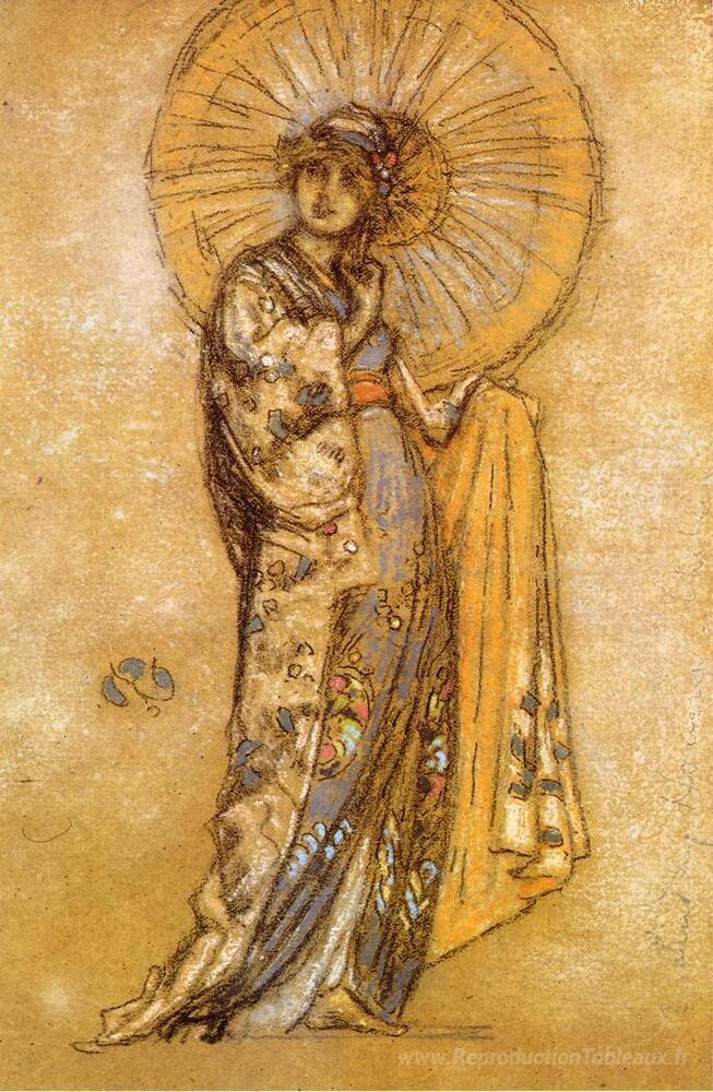Nous vous proposons une reproduction artisanale sur toile du célèbre tableau 'La robe japonaise' de James McNeill Whistler, provenant du Musée de la Reproduction.