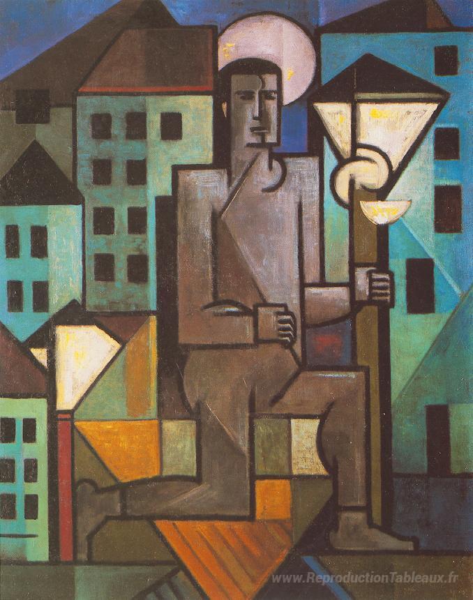 Nous vous proposons une reproduction artisanale sur toile du célèbre tableau 'Le briquet lampe' de Sandor Bortnyik, provenant du Musée de la Reproduction.