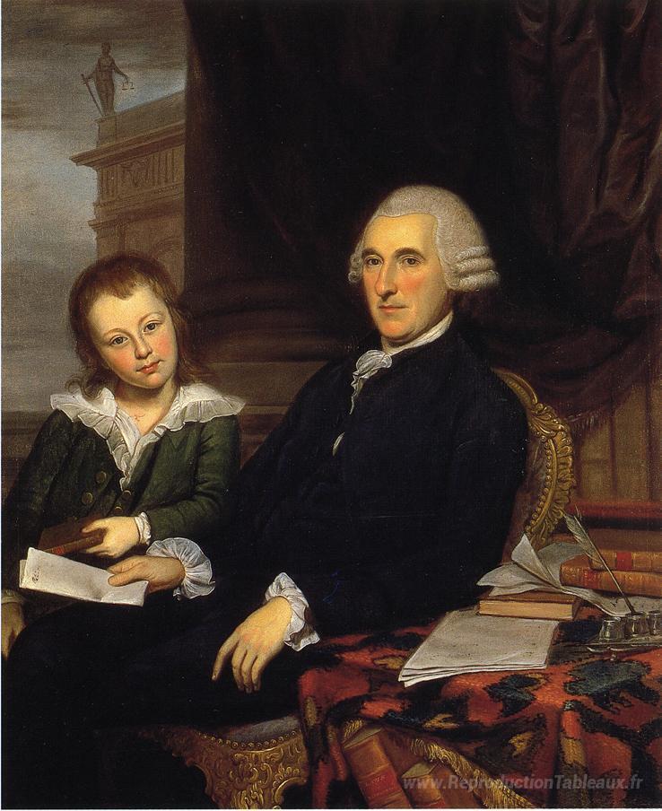 Nous vous proposons une reproduction artisanale sur toile du célèbre tableau 'Le gouverneur Thomas McKean et son fils, Thomas, Jr.' de Charles Willson Peale, provenant du Musée de la Reproduction.