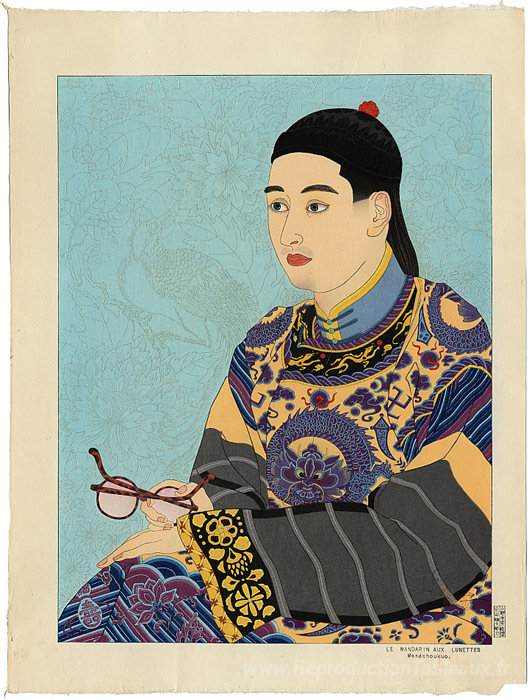 Nous vous proposons une reproduction artisanale sur toile du célèbre tableau 'Le Mandarin Aux Lunettes. Mandchoukuo' de Paul Jacoulet, provenant du Musée de la Reproduction.