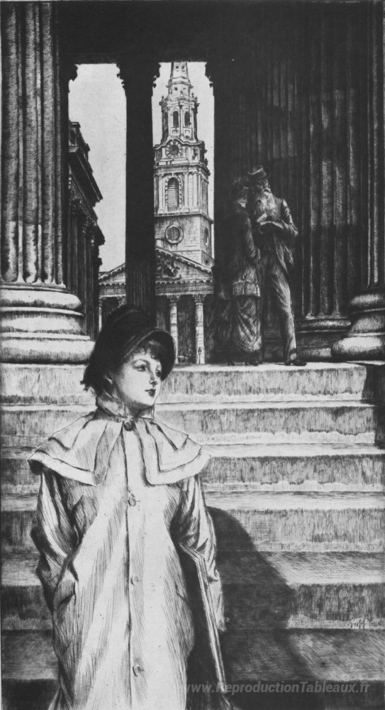 Nous vous proposons une reproduction artisanale sur toile du célèbre tableau 'Le portique de la National Gallery London' de James Tissot, provenant du Musée de la Reproduction.