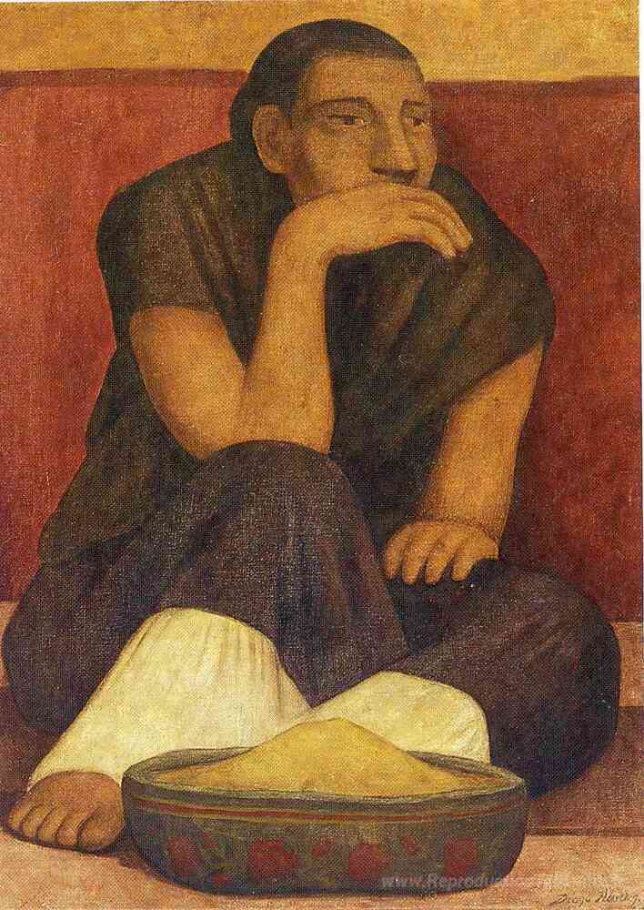 Nous vous proposons une reproduction artisanale sur toile du célèbre tableau 'Le vendeur de Pinole' de Diego Rivera, provenant du Musée de la Reproduction.