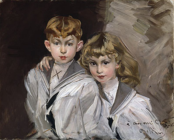 Nous vous proposons une reproduction artisanale sur toile du célèbre tableau 'Les deux enfants' de Giovanni Boldini, provenant du Musée de la Reproduction.