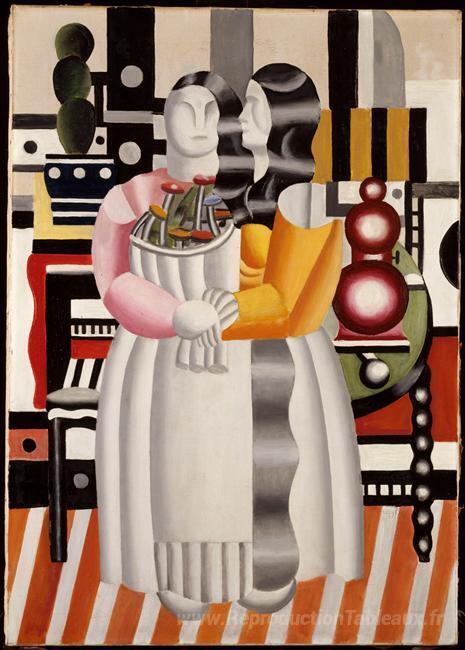 Nous vous proposons une reproduction artisanale sur toile du célèbre tableau 'Les deux femmes bouquet' de Fernand Leger, provenant du Musée de la Reproduction.