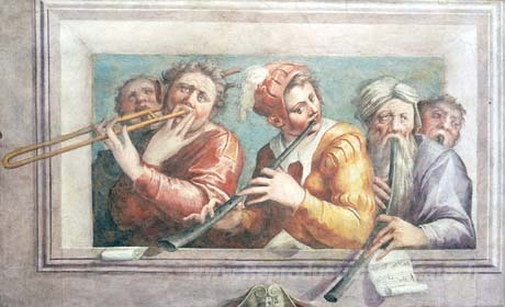 Nous vous proposons une reproduction artisanale sur toile du célèbre tableau 'Les musiciens' de Giorgio Vasari, provenant du Musée de la Reproduction.