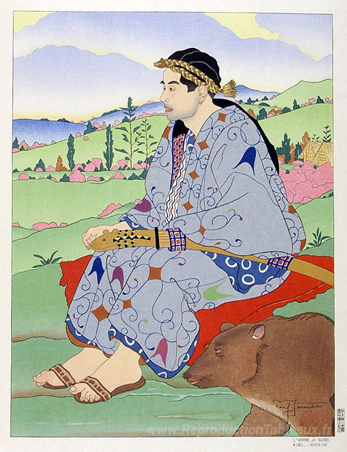 Nous vous proposons une reproduction artisanale sur toile du célèbre tableau 'L'Homme Au Sabre. Aino, Hokkaido' de Paul Jacoulet, provenant du Musée de la Reproduction.