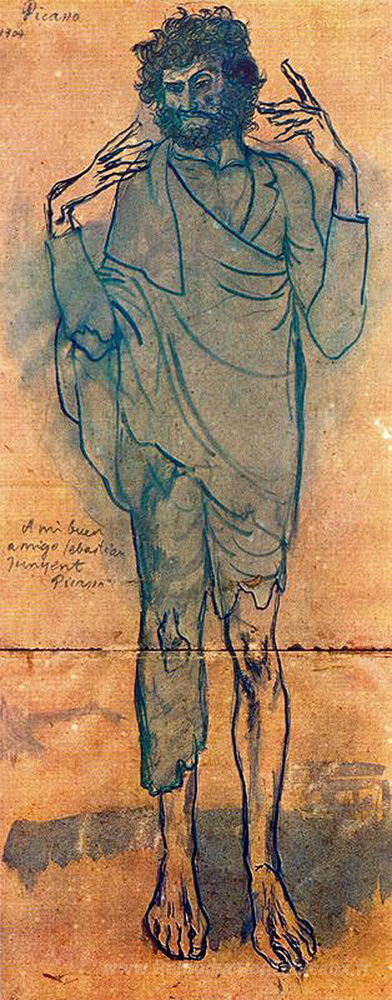 Nous vous proposons une reproduction artisanale sur toile du célèbre tableau 'L'idiot' de Pablo Picasso, provenant du Musée de la Reproduction.