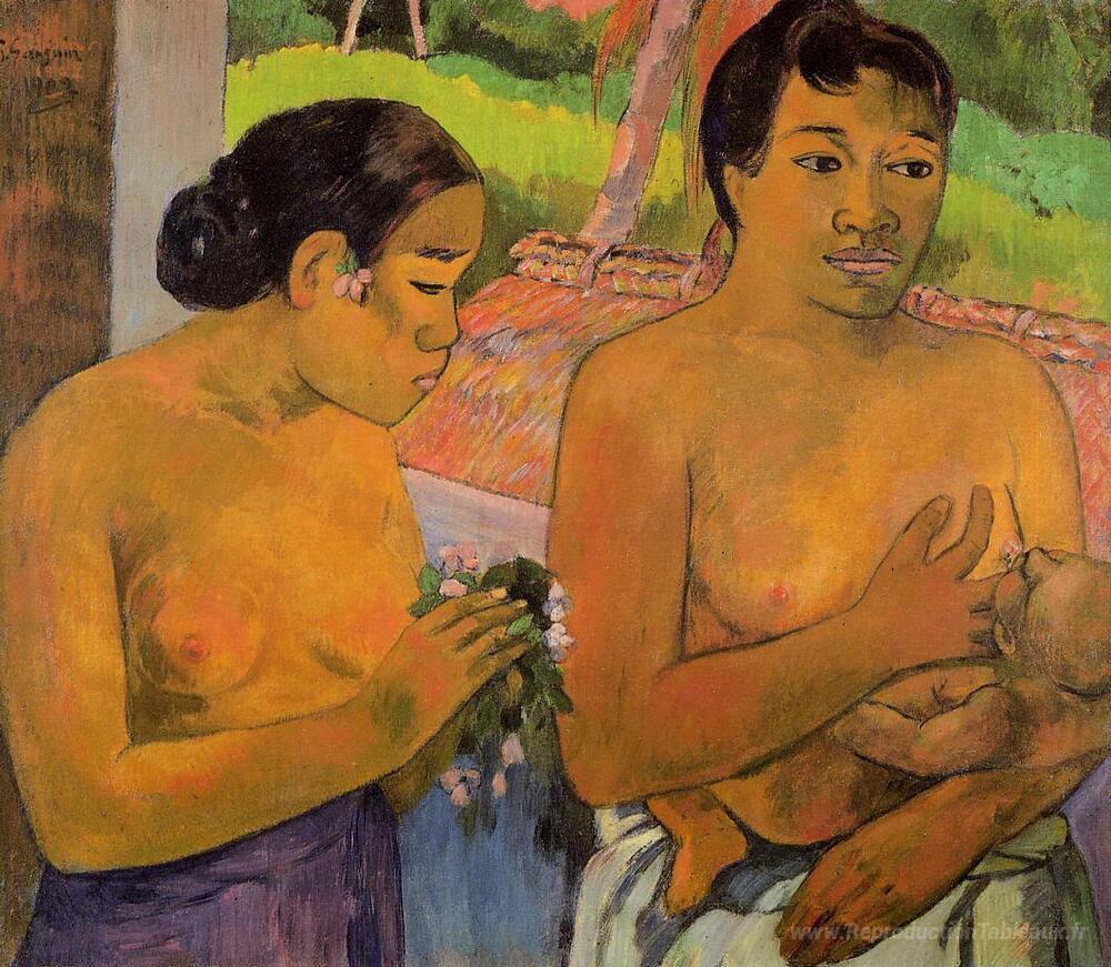 Nous vous proposons une reproduction artisanale sur toile du célèbre tableau 'L'offrande' de Paul Gauguin, provenant du Musée de la Reproduction.