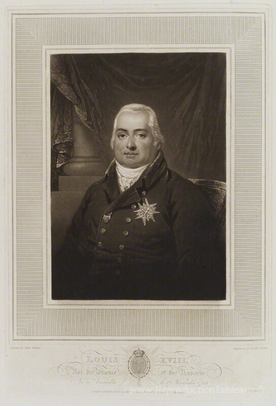 Nous vous proposons une reproduction artisanale sur toile du célèbre tableau 'Louis XVIII, roi de France' de Charles Turner, provenant du Musée de la Reproduction.