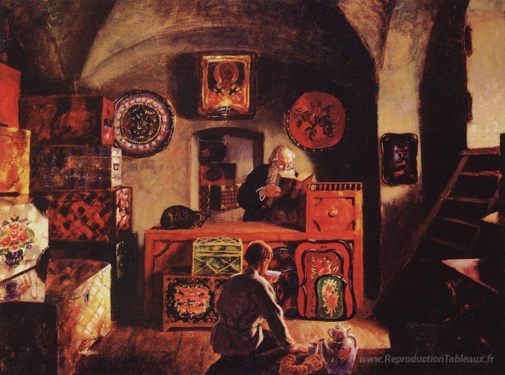 Bienvenue dans notre collection dédiée aux peintures à l'huile, où chaque œuvre raconte une histoire empreinte d'émotion et d'esthétique. Parmi nos pièces maîtresses, nous vous invitons à découvrir la fascinante œuvre Marchand de l'artiste renommé Boris Kustodiev. Ce tableau emblématique, né de la fusion des influences russes et d'un style vibrant, capte l'essence d'une époque tout en proposant une vision unique du marchand et de son environnement.