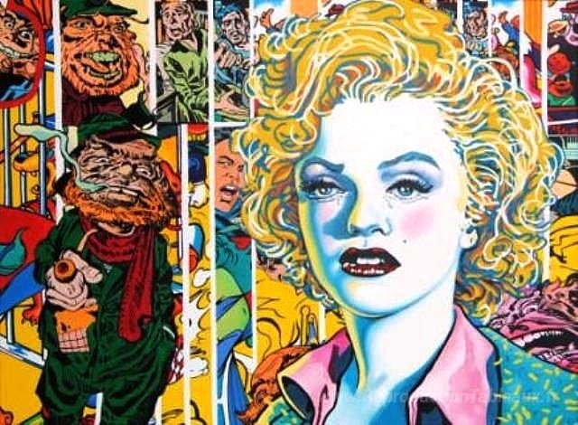 Nous vous proposons une reproduction artisanale sur toile du célèbre tableau 'Marilyn et le vieil homme' de Erro, provenant du Musée de la Reproduction.