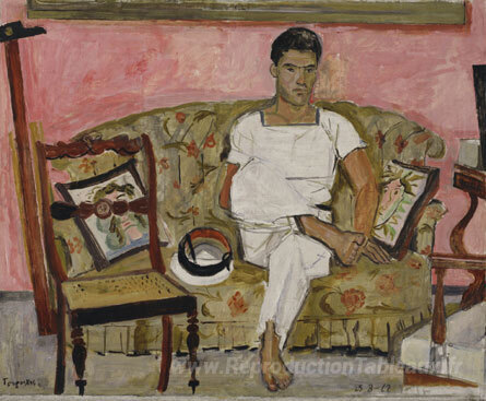 Nous vous proposons une reproduction artisanale sur toile du célèbre tableau 'Marin sans chaussures assis sur le canapé' de Yiannis Tsaroychis, provenant du Musée de la Reproduction.