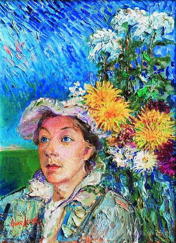 Nous vous proposons une reproduction artisanale sur toile du célèbre tableau 'Marusia avec des fleurs' de David Burliuk, provenant du Musée de la Reproduction.