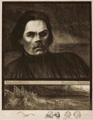 Nous vous proposons une reproduction artisanale sur toile du célèbre tableau 'Maxime Gorki a mi-corps de face' de Theophile Steinlen, provenant du Musée de la Reproduction.