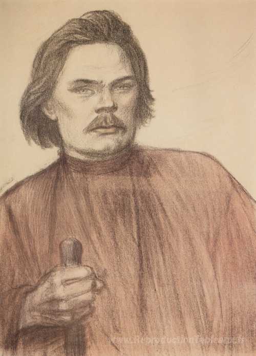 Nous vous proposons une reproduction artisanale sur toile du célèbre tableau 'Maxime Gorki a mi-corps de face' de Theophile Steinlen, provenant du Musée de la Reproduction.
