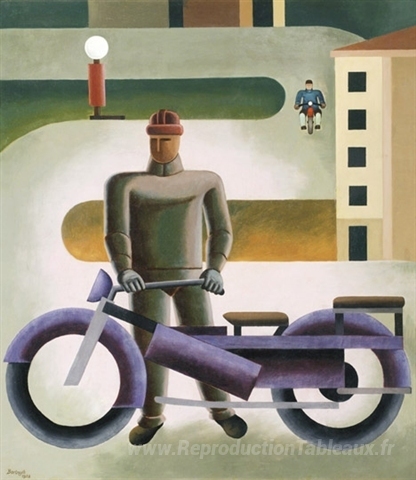 Nous vous proposons une reproduction artisanale sur toile du célèbre tableau 'Motorrider' de Sandor Bortnyik, provenant du Musée de la Reproduction.