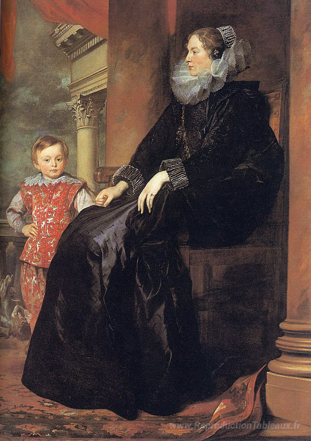 Nous vous proposons une reproduction artisanale sur toile du célèbre tableau 'Noble génoise avec son fils' de Anthony van Dyck, provenant du Musée de la Reproduction.