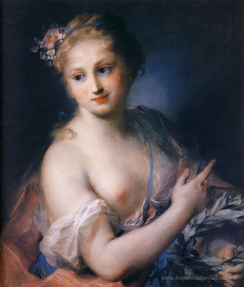 Nous vous proposons une reproduction artisanale sur toile du célèbre tableau 'Nymphe suivie d'Apollo' de Maurice Quentin de La Tour, provenant du Musée de la Reproduction.