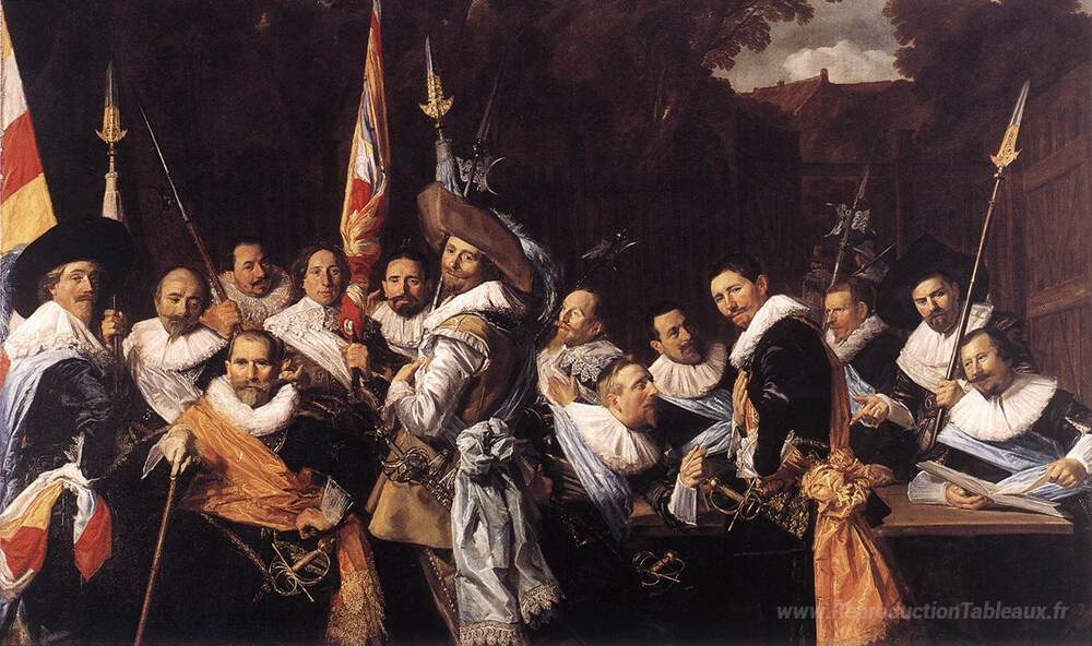 Nous vous proposons une reproduction artisanale sur toile du célèbre tableau 'Officiers et sergents de la garde civique St. Hadrien' de Frans Hals, provenant du Musée de la Reproduction.