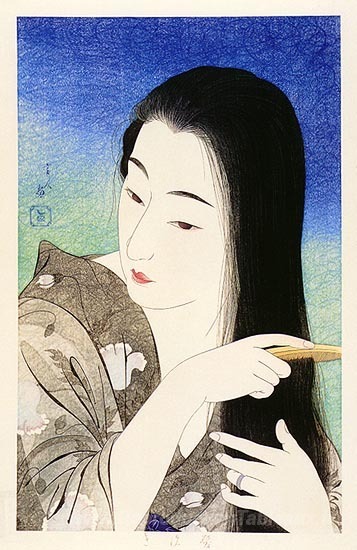 Nous vous proposons une reproduction artisanale sur toile du célèbre tableau 'Peigner les cheveux' de Torii Kotondo, provenant du Musée de la Reproduction.